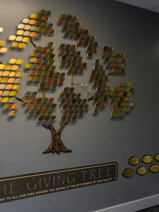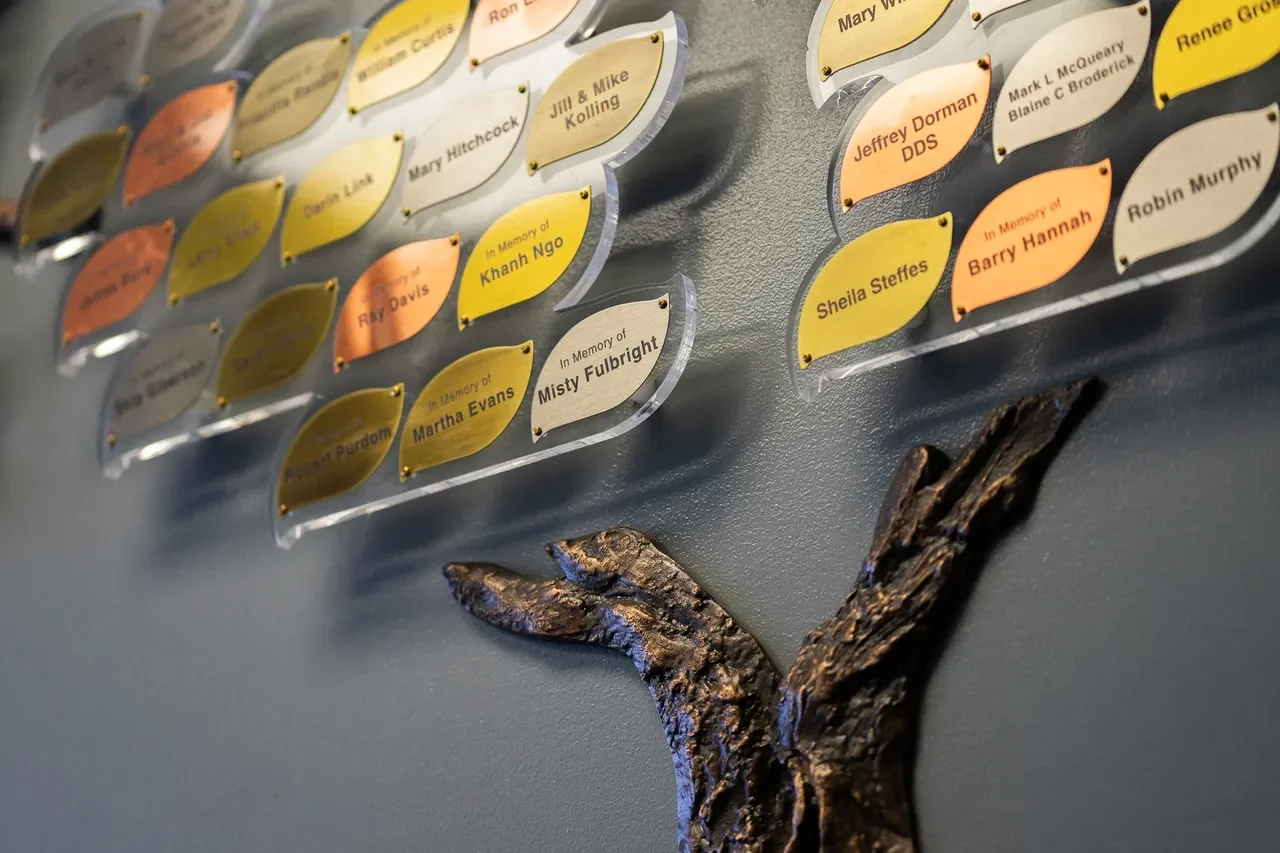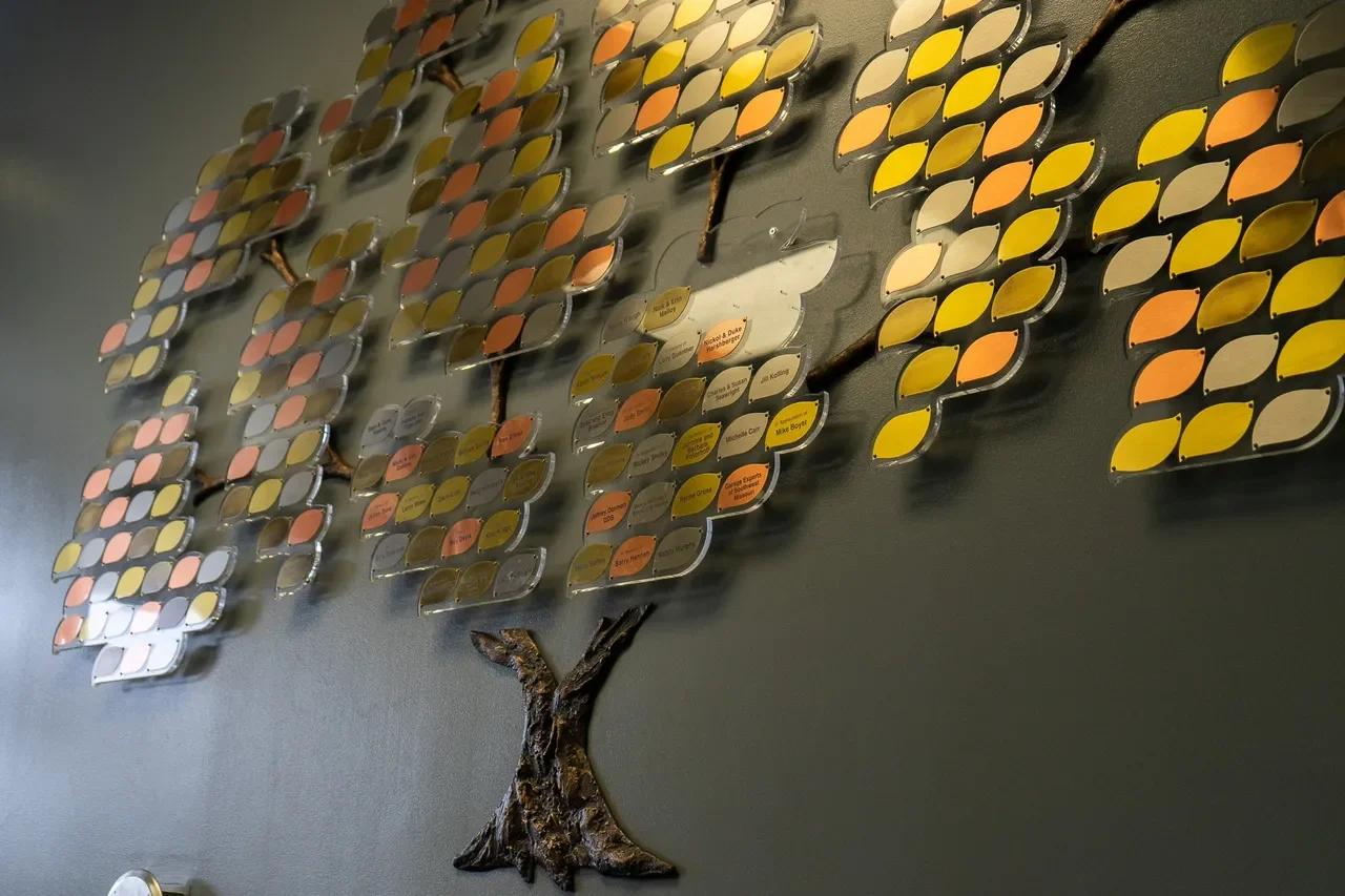 Our Giving Tree, displayed on the wall right inside of the Springfield Workshop location, features engraved leaves and foundation stones that honor individuals and organizations who support SWI’s mission. Each leaf or stone represents a donation made to our organization, with recognition given to donors who reach designated contribution levels.